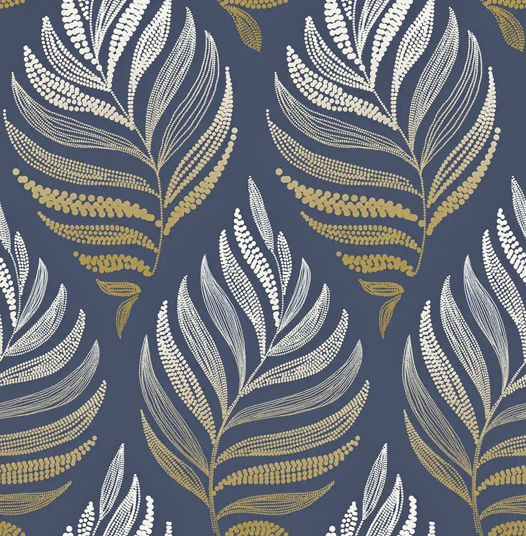 Elegant botanical leaf pattern in midnight blue and gold tones.
