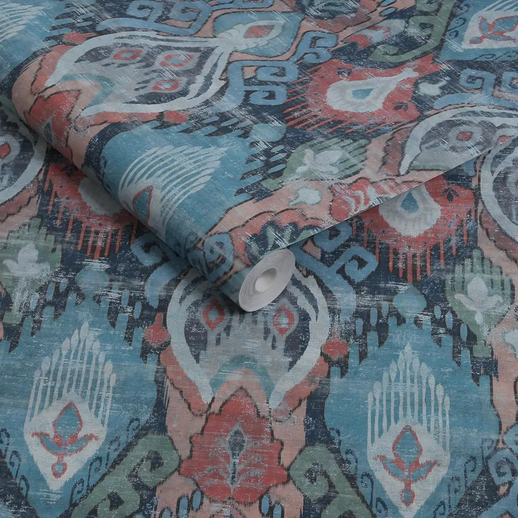 Boho ikat wallpaper with Pacific blue, aqua, and terracotta tones inspired by vintage textile patterns.