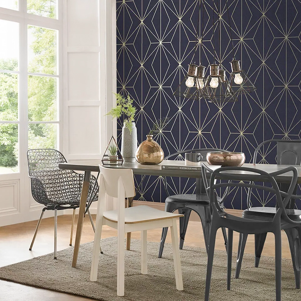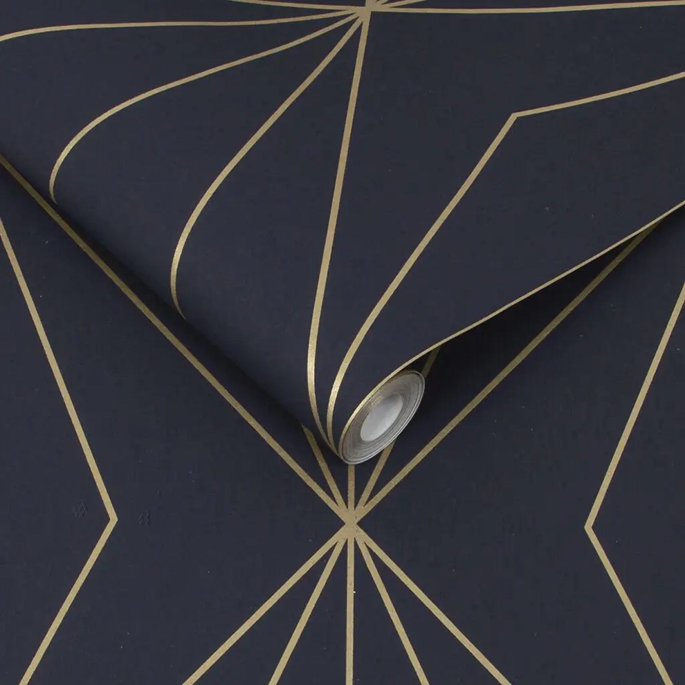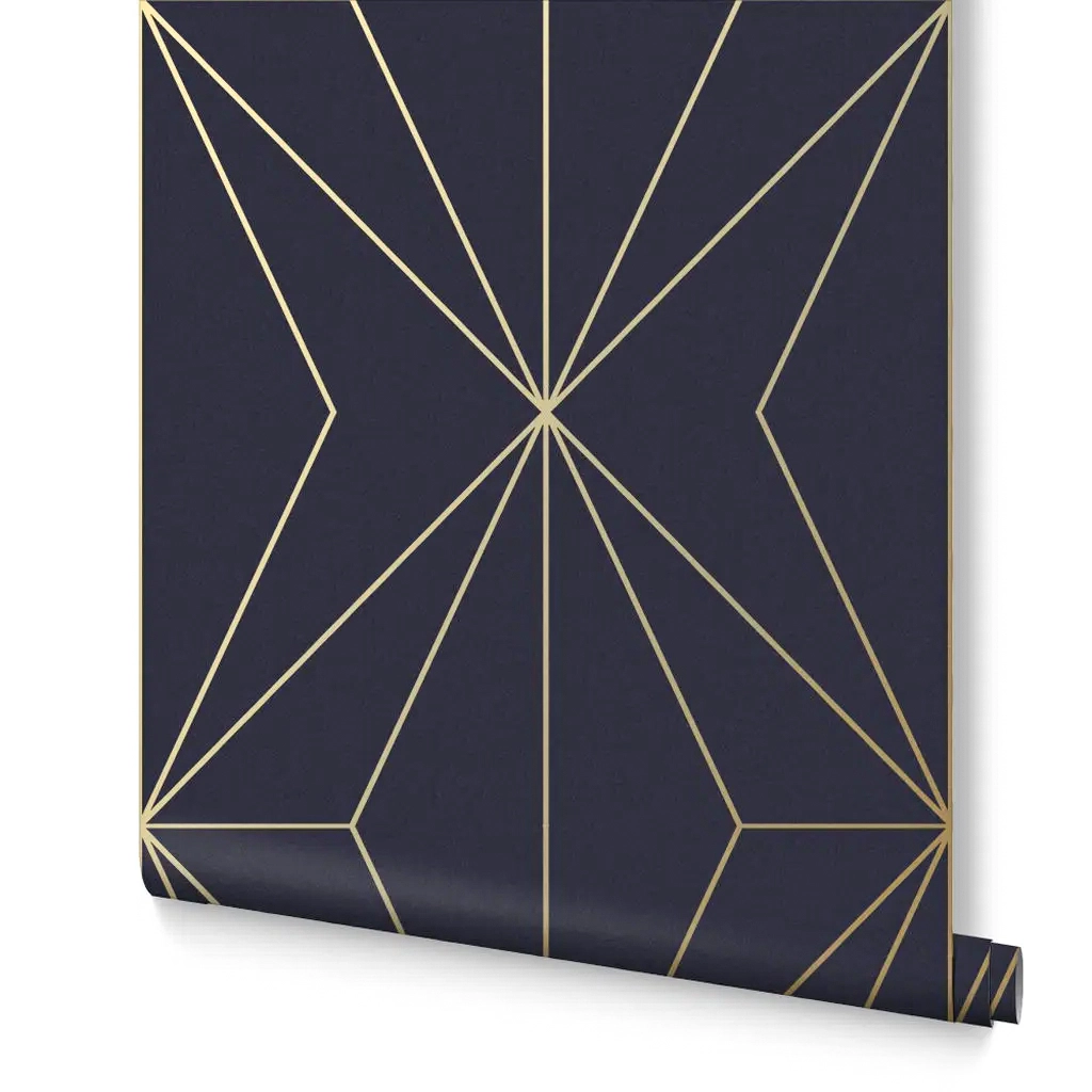 Pacific Midnight wallpaper features a bold geometric design on deep navy textured paper with elegant gold metallic accents—perfect for modern, luxury interiors.